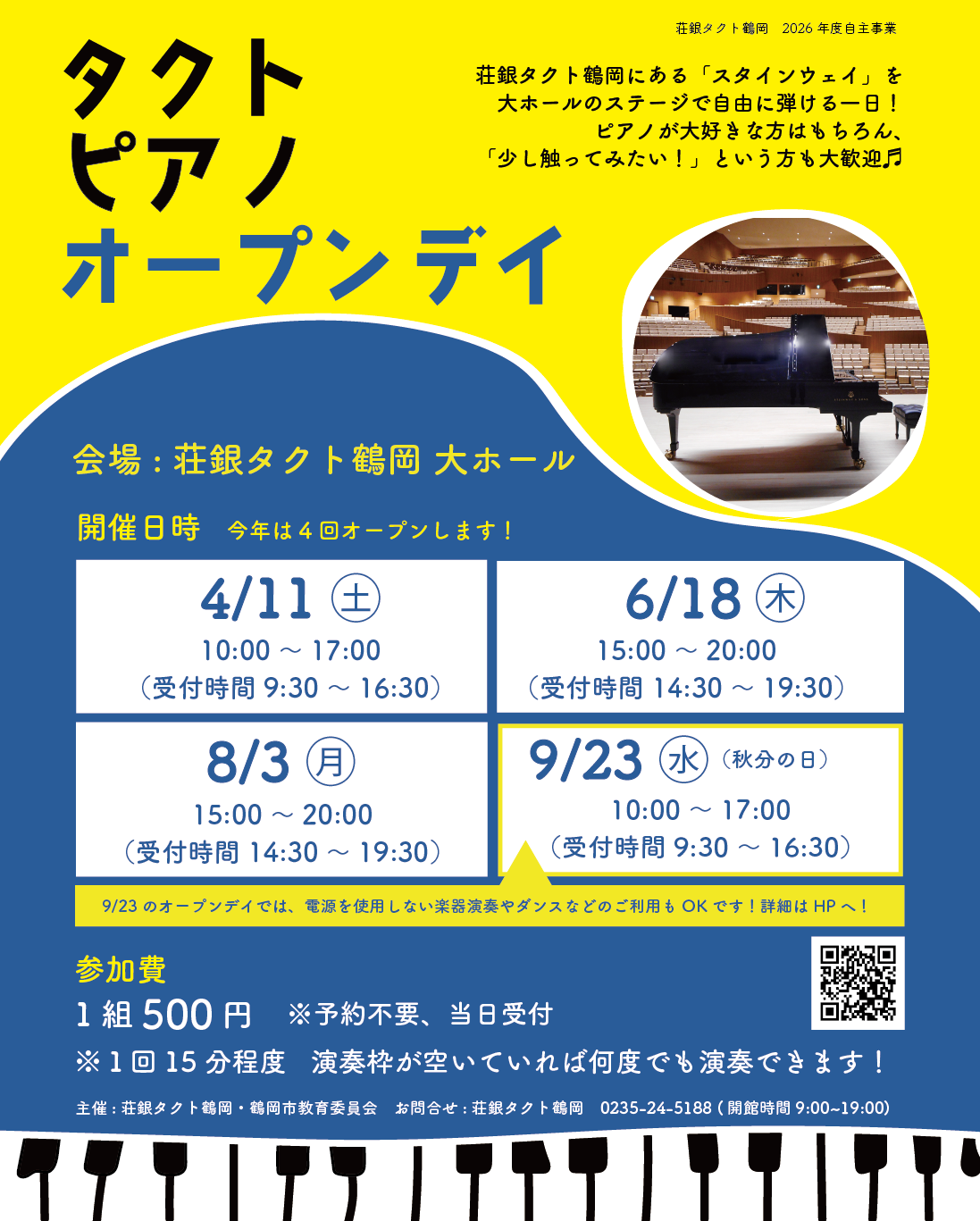 荘銀タクト鶴岡にある「スタインウェイ」を、大ホールのステージで自由に弾ける一日!ピアノが大好きな方はもちろん、「少し触ってみたい!」という方も大歓迎♬