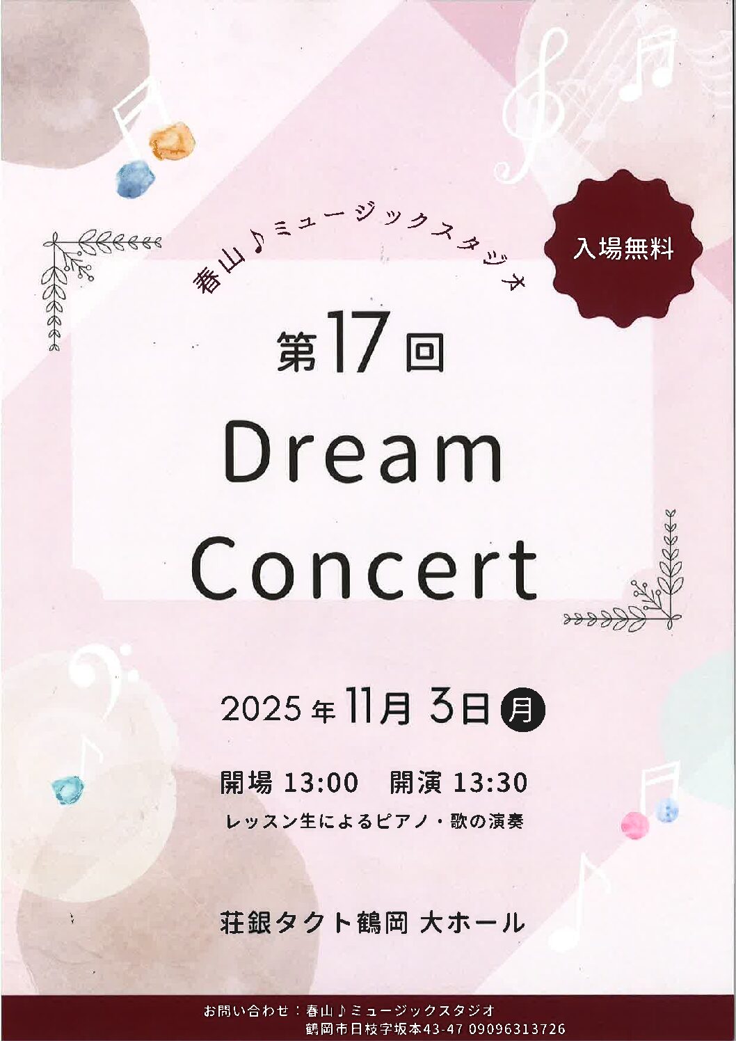 第17回ドリームコンサート 更新日 2025年09月28日(日) 第17回ドリームコンサート 日時/2025年11月3日(月・祝) 開場13:00 開演13:30 終演16:30 場所/大ホール 入場料/無料 お問合せ/春山ミュージックスタジオ TEL 090-9631-3726 公演一覧 2025年11月2日(日) 羽黒高等学校吹奏楽部 第37回定期演奏会 スペシャルゲスト アンドレ・アンリ 2025年11月3日(月) 第17回ドリームコンサート 2025年11月6日(木) 鶴岡東高等学校吹奏楽部 オータムコンサート2025 2025年11月8日(土) オペラの小道具をつくろう! つるおか市民オペラ 喜歌劇『こうもり』関連ワークショップ 2025年11月9日(日) ハウオリフラスタジオ20周年記念公演 Me ke aloha pumehana 心から愛を込めて 2025年11月15日(土) 血行めぐるポカポカヨガ 2025年11月16日(日) 吉続舞踊学園モダンダンス公演 2025年11月19日(水) カジミール・リベルスキー ピアノソロコンサート 2025年11月22日(土) 二兎社公演49『狩場の悲劇』 2025年11月23日(日) オペラの小道具をつくろう! つるおか市民オペラ 喜歌劇『こうもり』関連ワークショップ 2025年11月23日(日) 『踊る。遠野物語』関連企画 遠野物語スペシャルバスツアー 2025年11月25日(火) 第73回「音楽の夕べ」~あなたとクラゲと音楽と~【加茂水族館連携事業】 2025年11月27日(木) オペラシアターこんにゃく座公演 オペラ『森は生きている』 2025年11月29日(土) 鶴岡土曜会混声合唱団 第74回定期演奏会 2025年11月30日(日) スイング・クレインズ・ジャズ・オーケストラ 第25回定期演奏会 (ゲスト 阿川 泰子) 2025年12月3日(水) 第74回「音楽の夕べ」~あなたとクラゲと音楽と~【加茂水族館連携事業】 2025年12月6日(土) 第23回 バウムクーヘン コンサート 2025 2025年12月7日(日) 鶴岡吹奏楽団 第40回 定期演奏会 2025年12月13日(土) 血行めぐるポカポカヨガ 2025年12月14日(日) 田川地区アンサンブルコンテスト 2025年12月20日(土) タクトステージオープンデイ 2025年12月21日(日) ツルオカ・ミーティング・ジャズコンサート2025 2025年12月27日(土) 第50回田川地区高等学校合唱祭 2025年12月28日(日) 第2回「目で聴く身体で感じるコンサート」 2026年1月9日(金) Kバレエ・オプト『踊る。遠野物語』 2026年1月25日(日) つるおか市民オペラ 喜歌劇『こうもり』 2026年1月25日(日) 【鑑賞サポート】つるおか市民オペラ 喜歌劇『こうもり』 2026年1月30日(金) 第75回「音楽の夕べ」~あなたとクラゲと音楽と~【加茂水族館連携事業】 2026年2月7日(土) 第60回鶴岡工業高等学校吹奏楽部 定期演奏会 2026年2月14日(土) 令和7年度鶴岡市民俗芸能交流発表会 2026年2月20日(金) 第76回「音楽の夕べ」~あなたとクラゲと音楽と~【加茂水族館連携事業】 2026年3月1日(日) TUY特選落語会~其の陸~ 立川志らく 柳家喬太郎 二人会 2026年3月23日(月) 第77回「音楽の夕べ」~あなたとクラゲと音楽と~【加茂水族館連携事業】