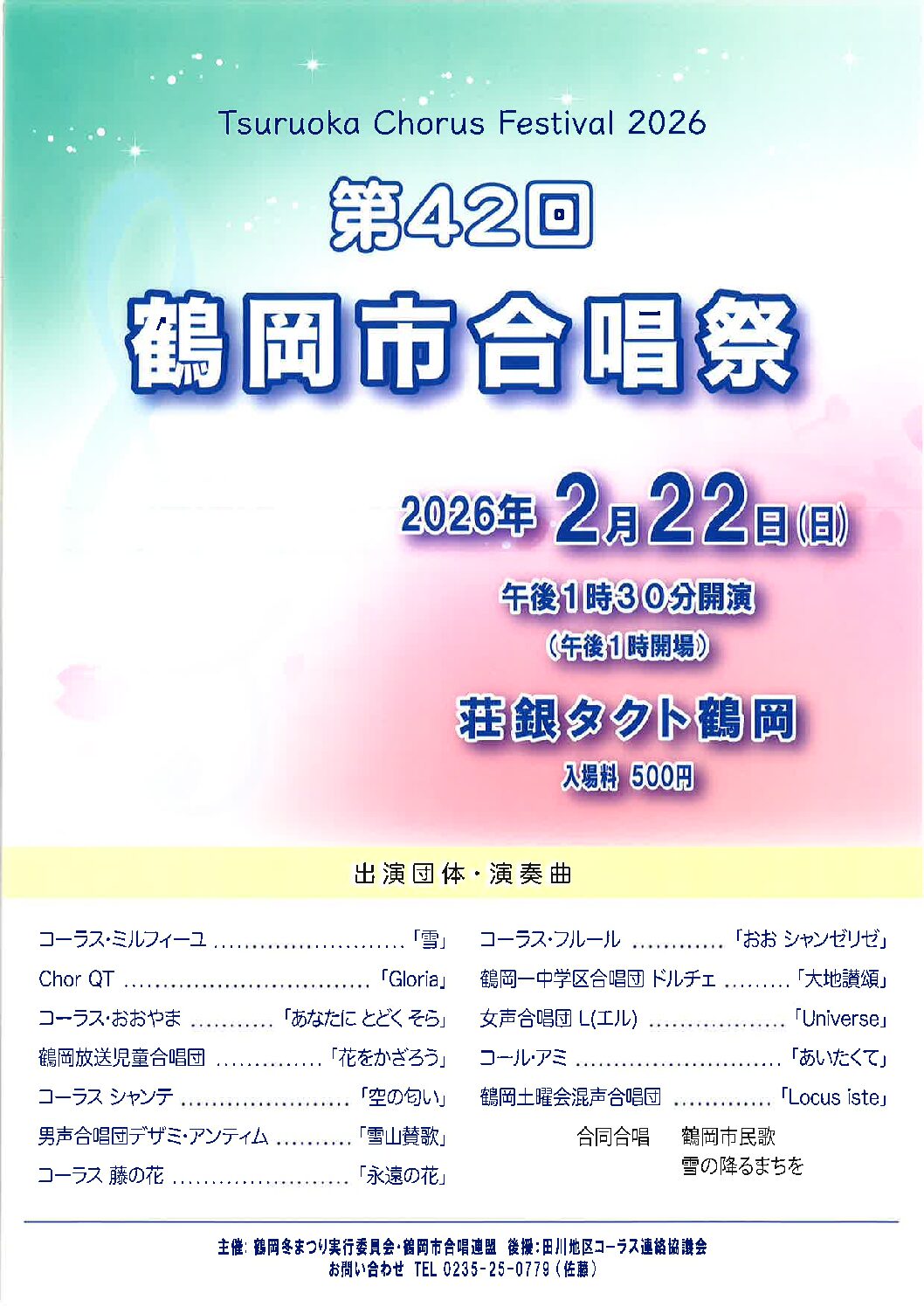 第42回鶴岡市合唱祭 更新日 2025年12月24日(水) 第42回鶴岡市合唱祭 日時/2026年2月22日(日) 開場 13:00 開演 13:30 終演 16:00 場所/大ホール 入場料/500円 問合せ/鶴岡市合唱連盟 TEL 0235-25-0779 公演一覧 2026年2月7日(土) 第60回鶴岡工業高等学校吹奏楽部 定期演奏会 2026年2月11日(水) 田川地区高等学校吹奏楽祭 2026年2月14日(土) 令和7年度鶴岡市民俗芸能交流発表会 2026年2月15日(日) ヤマハ ジュニアオリジナルコンサート 2026年2月16日(月) 劇団民藝公演『グレイクリスマス』 2026年2月20日(金) 第76回「音楽の夕べ」~あなたとクラゲと音楽と~【加茂水族館連携事業】 2026年2月21日(土) 血行めぐるポカポカヨガ 2026年2月22日(日) 第42回鶴岡市合唱祭 2026年2月28日(土) 鶴岡中央高校演劇部 春公演 2026年3月1日(日) TUY特選落語会~其の陸~ 立川志らく 柳家喬太郎 二人会 2026年3月7日(土) タクト探検隊~舞台をあそべ!~ 2026年3月14日(土) 血行めぐるポカポカヨガ 2026年3月15日(日) 2026鶴岡太鼓フェスティバル 2026年3月21日(土) スプリングブラスコンサート 2026年3月22日(日) 山形トヨペット&レクサス山形Presents 山形交響楽団グリーンコンサートin鶴岡 2026年3月23日(月) 第77回「音楽の夕べ」~あなたとクラゲと音楽と~【加茂水族館連携事業】 2026年3月27日(金) 鶴岡東高等学校 吹奏楽部 ソロ&アンサンブルコンサート2026 2026年3月28日(土) 「生命の光」上映会 2026年3月29日(日) 月の山よさこい祭り 2026年6月28日(日) 茨木のり子生誕100年のつどい~朗読つぎ、歌いつぎ、語りつぐ~