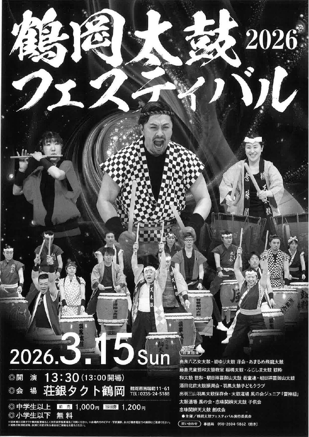 問合せ/鶴岡太鼓フェスティバル実行委員会 TEL 090-2604-9862(鈴木)