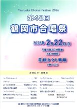 第42回鶴岡市合唱祭 日時/2026年2月22日(日) 開場 13:00 開演 13:30 終演 16:00 場所/大ホール 入場料/500円 問合せ/鶴岡市合唱連盟 TEL 0235-25-0779